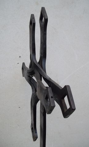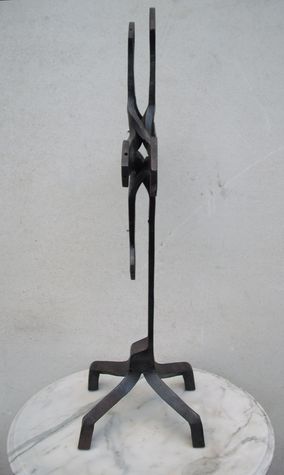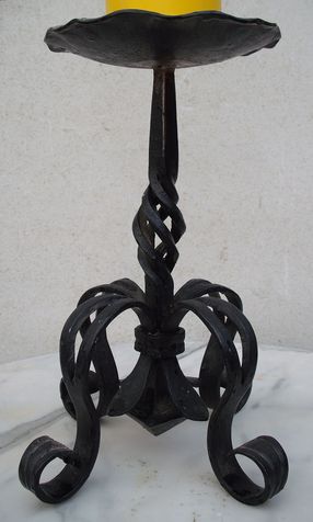 Kerzenständer geschmiedet; Höhe 300 mm. Füße und Zwirbel gespalten, Stabende vierkant angestaucht und pyramidal abgeschmiedet.