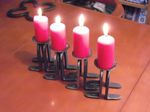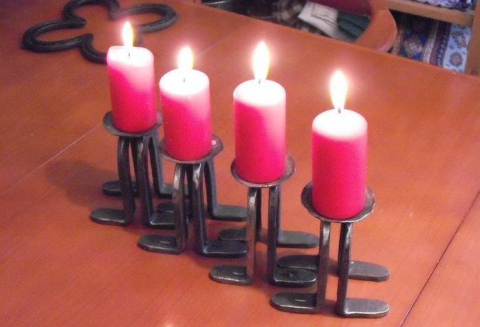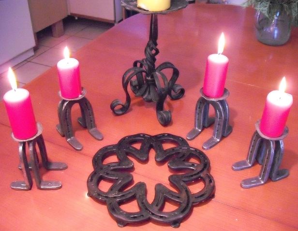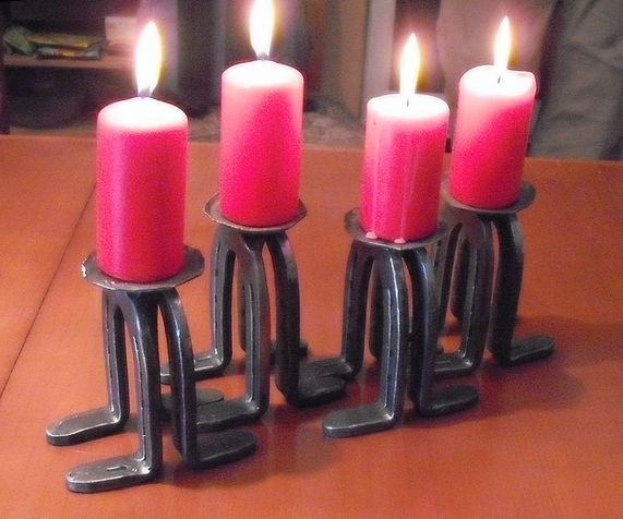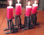 Vier Kerzenständer, aus Hufeisen geschmiedet, Höhe ca. 140 mm. Einzeln oder als Gruppe verwendbar. X