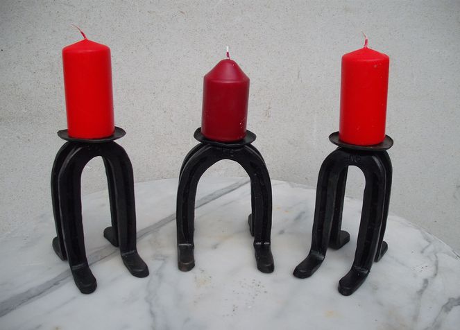 Drei Kerzenständer, aus Hufeisen geschmiedet, Höhe ca. 140 mm, schmale und breite Version.
