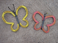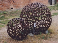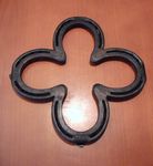 Untersetzer für Töpfe & Pfannen etc. aus 4 Hufeisen (Durchmesser 280 mm); durch die gebogenen Kappen oder Aufzüge am Hufeisen ist der Untersetzer ca. 6 bis 7 mm von der Tischplatte entfernt. Oberflächenbehandlung: brüniert.