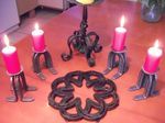 Vier Kerzenständer, aus Hufeisen geschmiedet, Höhe ca. 140 mm. Einzeln oder als Gruppe verwendbar. X